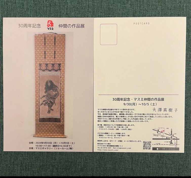 30周年・マスミ仲間の作品展 9/30-10/5 公開日:2024-09-27 展示のお知らせ グループ展のお知らせ「30周年記念・マスミ仲間の作品展」に出展します✨✨マスミギャラリーオーナーの横尾さんが「深夜の森」を掛け軸に仕立て下さり、展示します。「深夜の森」は深いブルーの中に銀色の部分が木のように表現できた作 […] 続きを読む